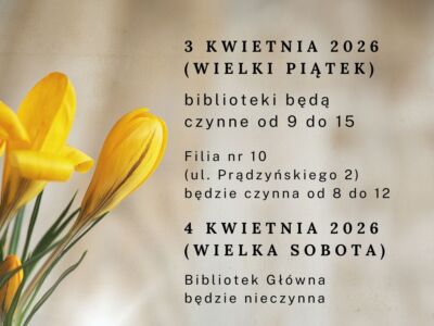 3 kwietnia 2026 (Wielki Piątek) biblioteki będą czynne od 9 do 15. Filia nr 10 (ul. Prądzyńskiego 2) będzie czynna od 8 do 12. 4 kwietnia 2026 (Wielka sobota) Bibliotek Główna będzie nieczynna.