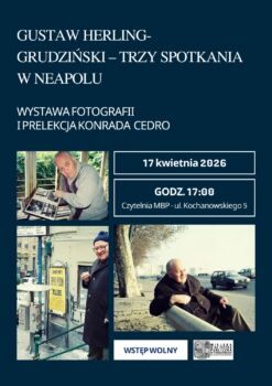Miejska Biblioteka Publiczna zaprasza na wystawę fotografii i prelekcję Konrada Cedro pt. „Gustaw Herling Grudziński TRZY SPOTKANIA W NEAPOLU”, 17 kwietnia 2026 r. o godz. 17:00 do Czytelni MBP przy l. Kochanowskiego 5. Wstęp wolny.