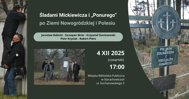 Iwona2025-12-01T12:11:12+01:00Miejska Biblioteka Publiczna zaprasza na spotkanie pt. „Śladami Mickiewicza i „Ponurego” po Ziemi Nowogródzkiej i Polesiu”, 4 grudnia 2025 r. o godz. 17:00 do Czytelni Biblioteki przy ul. Kochanowskiego 5. Wstęp wolny. „Ktokolwiek będziesz w nowogródzkiej stronie …”, czyli ilustrowane unikatowymi zdjęciami wspomnienia z wyprawy śladami Adama Mickiewicza i Jana Piwnika „Ponurego” po Ziemi Nowogródzkiej i Polesiu. Wspominać będą: Jarosław Babicki – redaktor naczelny Tygodnika Starachowickiego, inicjator wyprawy „Ponury” na Nowogródczyźnie. Szczepan Mróz – prezes „Stowarzyszenia Pamięci Ponury – Nurt” – Jak „zdobyliśmy” więzienie w Pińsku, czyli wspomnienie legendarnej akcji „Ponurego”. Krzysztof Daniszewski – Polskie Towarzystwo Historyczne – Mickiewicziana Ziemi Nowogródzkiej [...]
