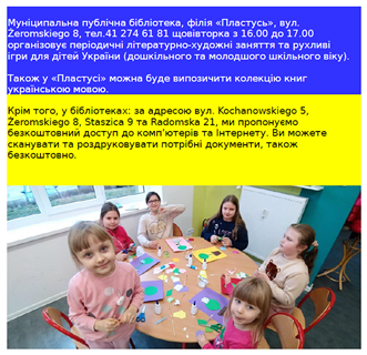 Miejska Biblioteka Publiczna, filia „Plastuś”, ul. Żeromskiego 8, tel. 41 274 61 81 organizuje cykliczne zajęcia literacko - plastyczne i zabawy ruchowe dla dzieci ukraińskich (w wieku przedszkolnym i wczesnoszkolnym), w każdy wtorek, w godzinach 16.00 - 17.00. W „Plastusiu” będzie także dostępny księgozbiór w języku ukraińskim do wypożyczenia. Ponadto w bibliotekach: przy ul. Kochanowskiego 5, Żeromskiego 8, Staszica 9 i Radomskiej 21 oferujemy bezpłatny dostęp do komputerów i internetu. Istnieje możliwość zeskanowania i wydruku potrzebnych dokumentów, również bezpłatnie.