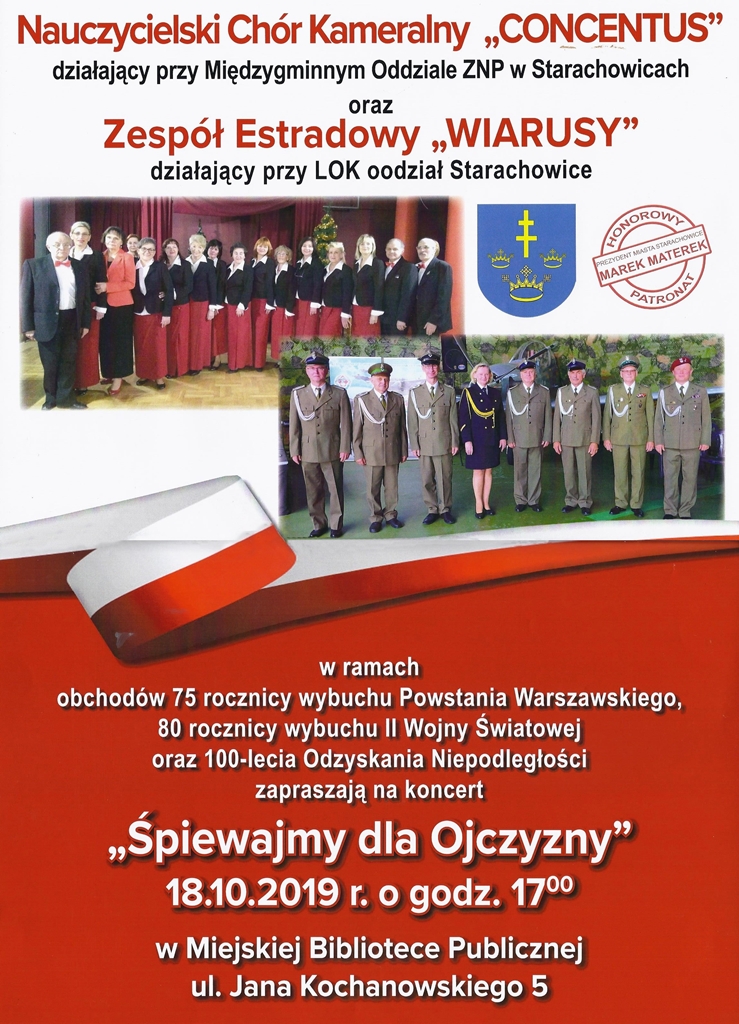 Nauczycielski Chór Kameralny „Concentus” Działający przy Międzygminnym Oddziale ZNP w Starachowicach oraz Zespół Estradowy „Wiarusy” Działający przy LOK oddział Starachowice wystąpili w ramach obchodów 75 rocznicy wybuchu Powstania Warszawskiego, 80 rocznicy wybuchu II Wojny Światowej oraz 100-lecia Odzyskania Niepodległości z koncertem "Śpiewajmy dla Ojczyzny”.