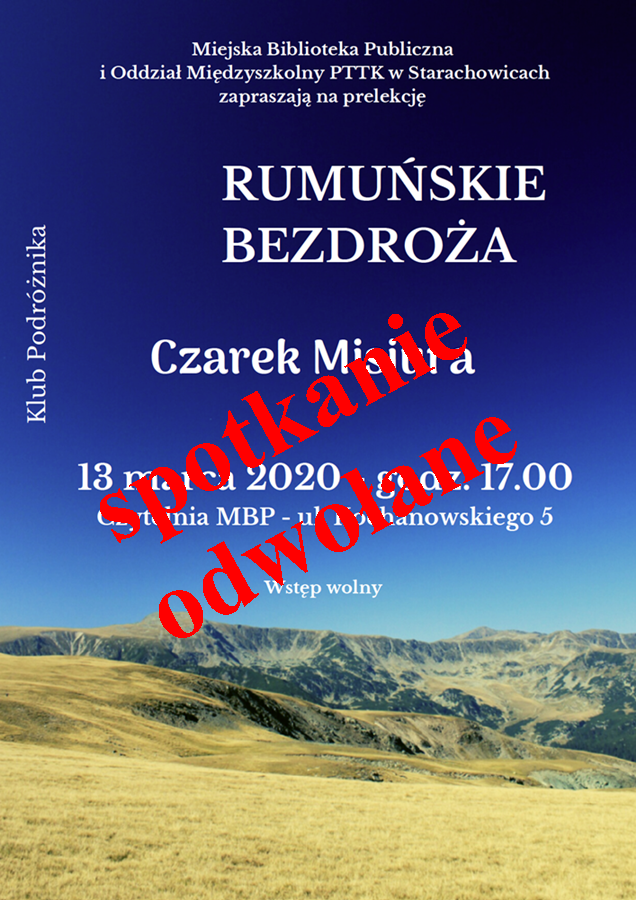 W związku z zagrożeniem koronawirusem odwołujemy spotkanie z Czarkiem Misiurą pt. „Rumuńskie bezdroża”, które było zaplanowane na piątek 13 marca 2020 r.